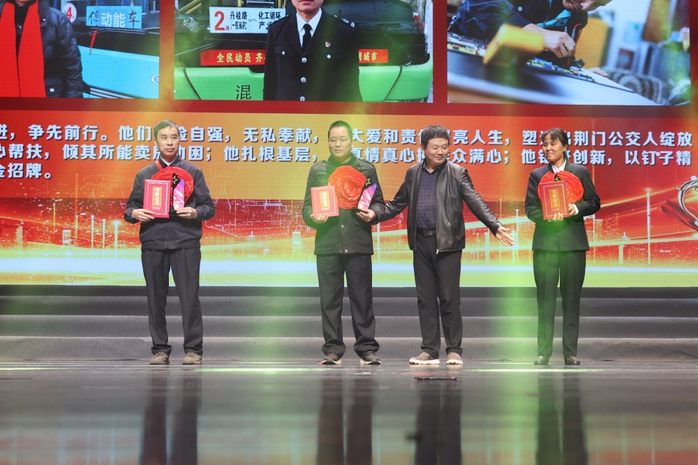 頒獎(jiǎng)環(huán)節(jié),在荊門公交發(fā)展歷程中做出過杰出貢獻(xiàn)的8名“時(shí)代標(biāo)兵”人物,被授予“崢嶸歲月”“風(fēng)華正茂”“無悔青春”時(shí)代標(biāo)兵,感謝他們一路走來的無私付出和拼搏奮斗。