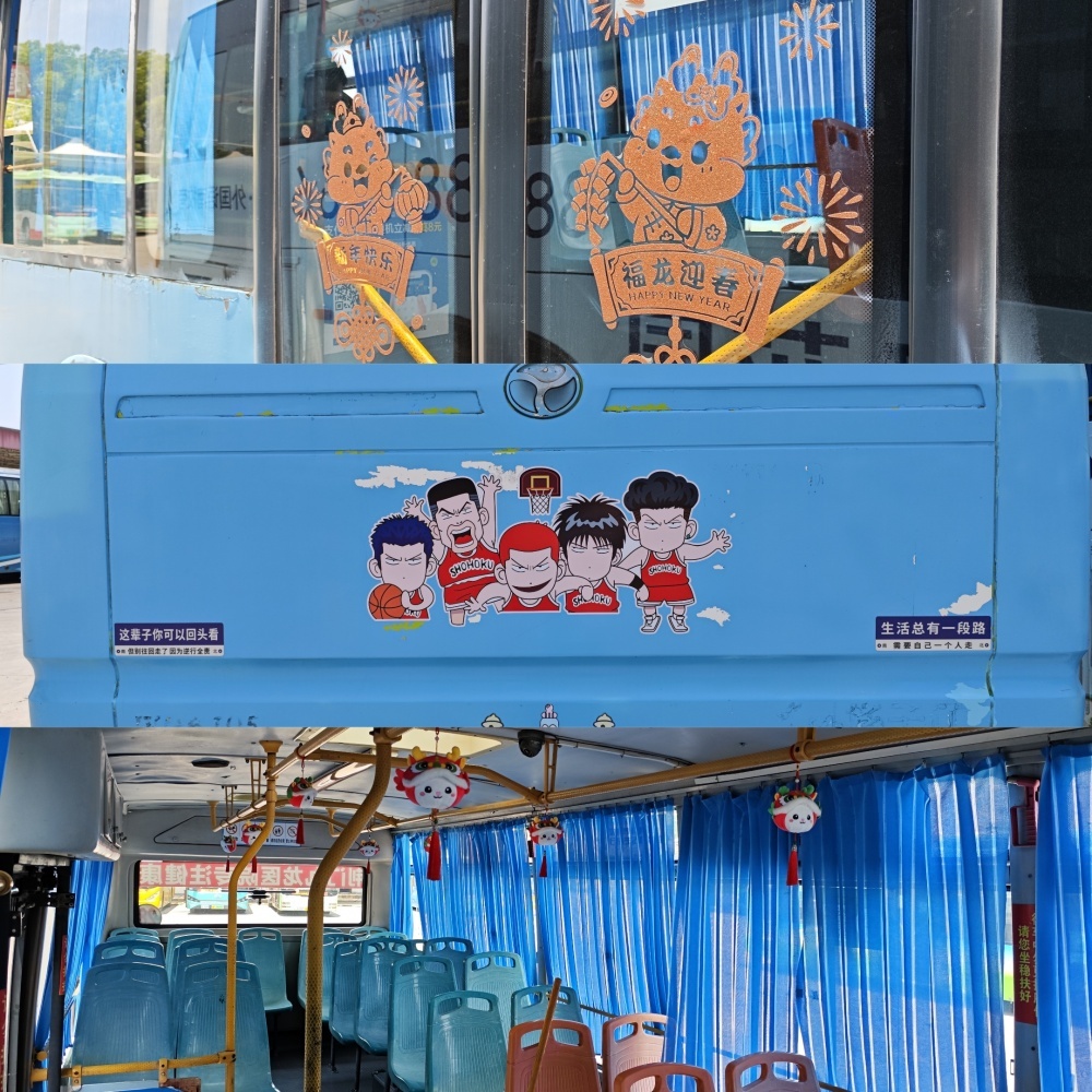 2020#車還有另外幾處細節(jié),引起小編注意,上下車門處貼有卡通人物和“福龍迎春”貼紙,車尾部貼有“灌籃高手”人物貼紙和提示標(biāo)語,車廂內(nèi)的扶手桿則掛滿了喜慶娃娃??吹竭@些裝飾和布置,仿佛感受到了駕駛員的熱情、認真和細膩。