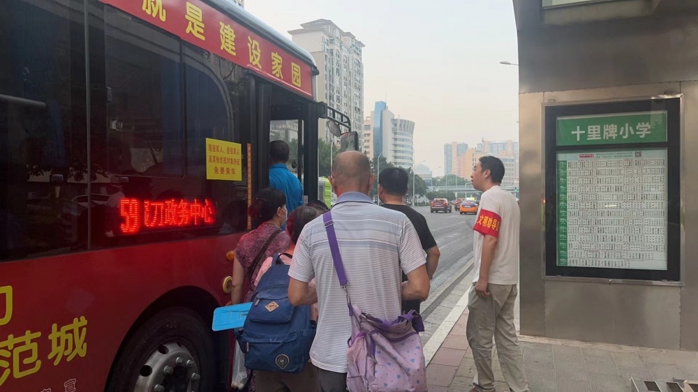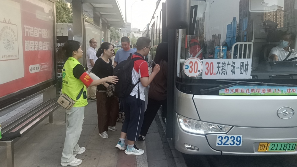 開學當天,人流大、車輛多,在城區(qū)各個學校附近,公交志愿者身穿綠馬甲或是佩戴安全袖章,守候在關(guān)鍵路口、站臺和斑馬線,面帶笑容引導(dǎo)學生安全出行。