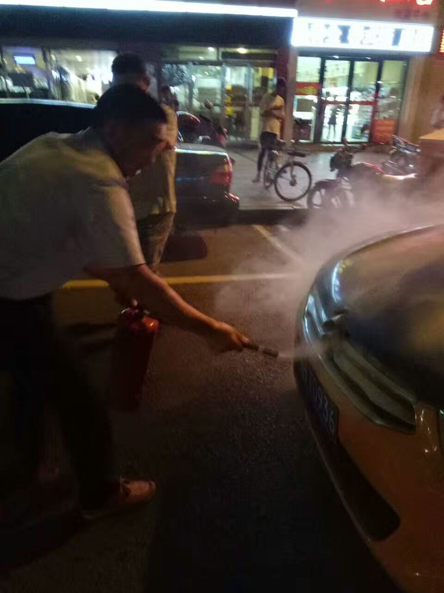 7月21日晚9時(shí)10分左右,公交集團(tuán)三公司2路車駕駛員陳旭駕駛鄂H0A073號(hào)行駛至金地廣場(chǎng)站,突然聽(tīng)到馬路對(duì)面有人大聲疾呼“著火啦!救火!”,陳師傅忙停穩(wěn)車,只見(jiàn)對(duì)面一的士引擎蓋冒煙起火,他立即拿起公交車上的滅火器快跑到馬路對(duì)面,將出租車的火撲滅。